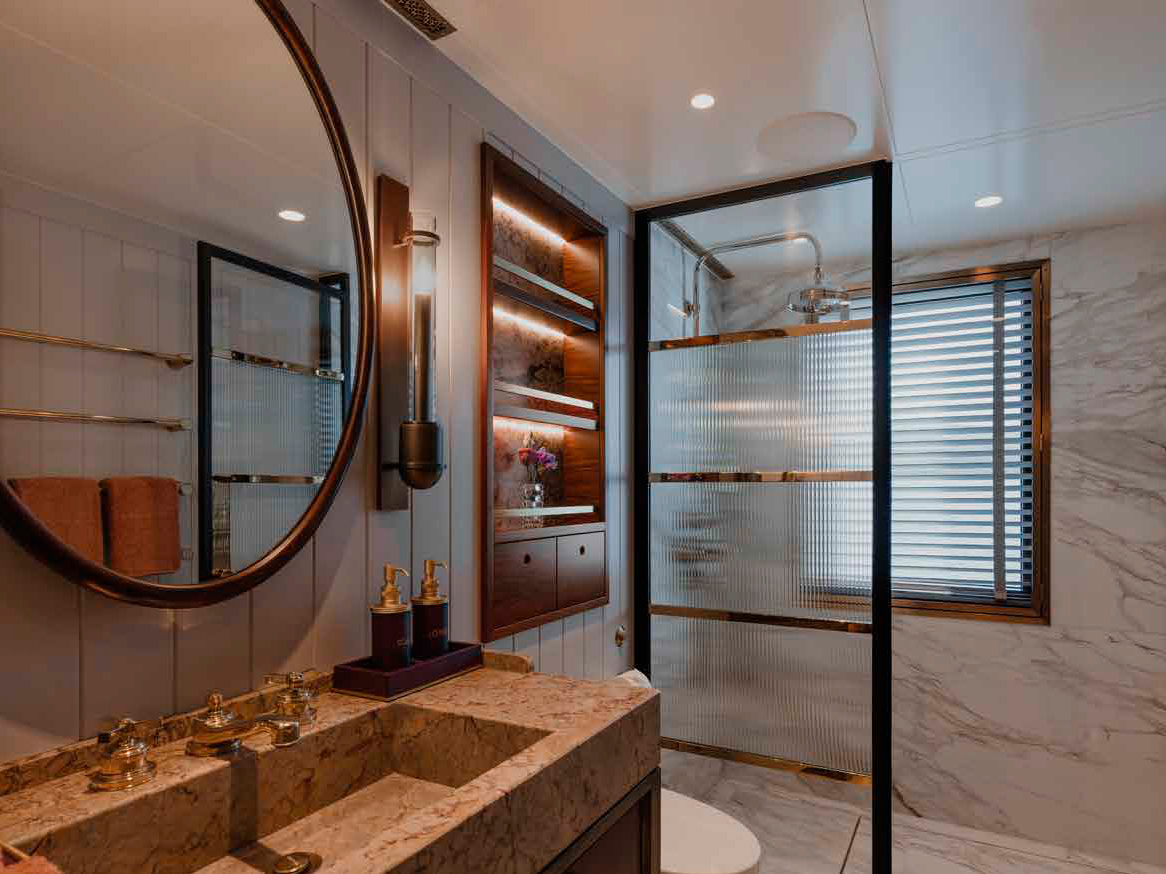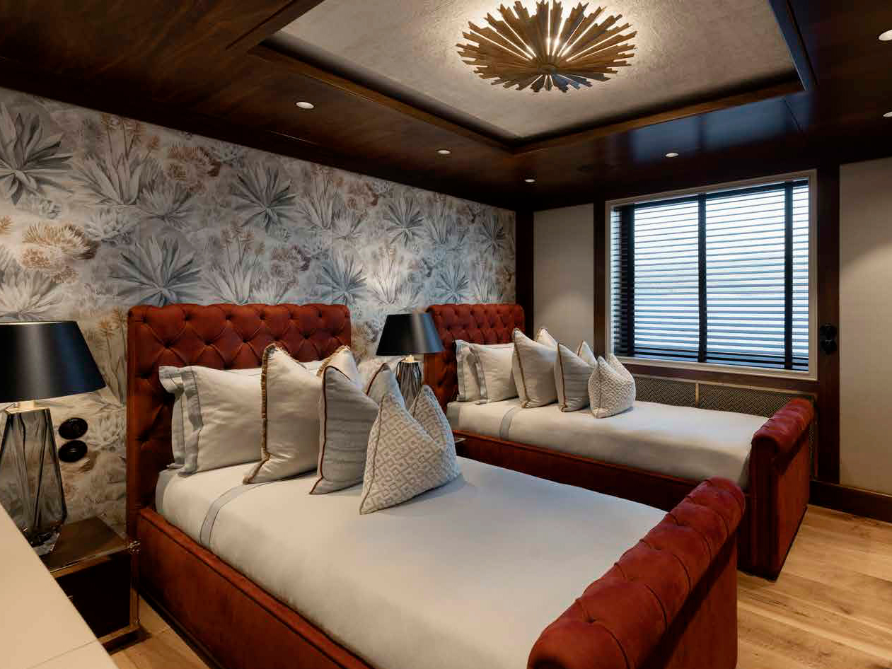Comprised of six main-deck bedrooms, the principal suite stands out as a highlight. It features an open-plan bedroom, an adjacent siesta room with a daybed, and an en-suite with a steam shower.